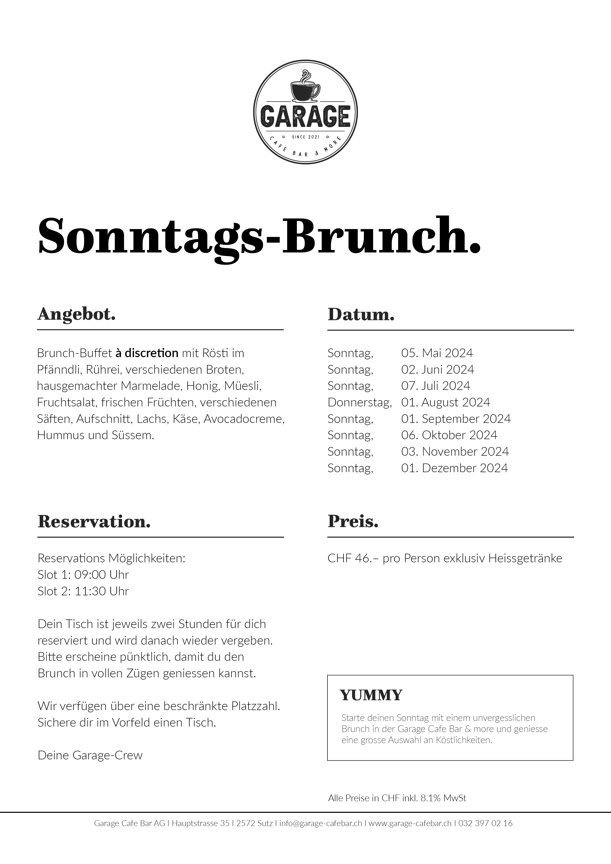 Sonntags-Brunch Sonntag, 7. Juli 2024 09:00 13:00 Garage Cafe Bar AG 35 Hauptstrasse Sutz, BE, 2572 Schweiz (Karte) Google Kalender ICS Sonntags-BrunchStarte deinen Sonntag mit einem unvergesslichen Brunch in der Garage Cafe Bar & more und geniesse eine grosse Auswahl an Köstlichkeiten. Online Reservation