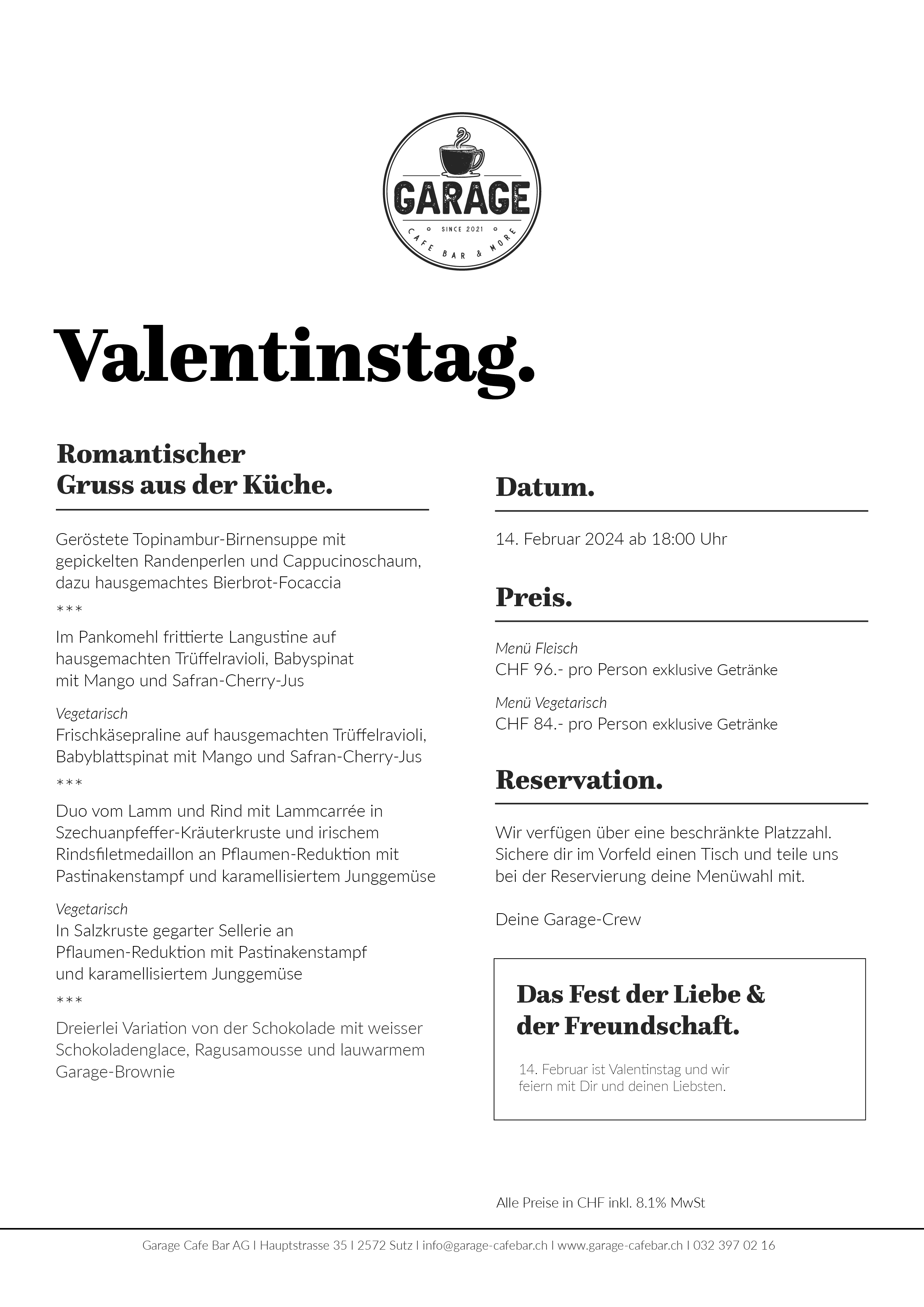 Valentinstag Mittwoch, 14. Februar 2024 18:00 23:00 Garage Cafe Bar AG 35 Hauptstrasse Sutz, BE, 2572 Schweiz (Karte) Google Kalender ICS